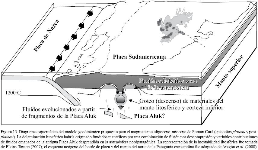 El pasaje de la Placa de Aluk por debajo de la actual provincia de Somún Curá habría inyectado fluidos de zona de subducción y fundidos en el manto somero. Estos producen el efecto dual de ascender la temperatura e hidratar la litósfera nordpatagónica, provocando el descenso de la viscosidad litosférica y favoreciendo en consecuencia procesos de delaminación debido a inestabilidades dúctiles del tipo RayleighTaylor (ElkinsTanton 2005, 2007). Los procesos de deshidratación/fusión parcial de la Placa de Aluk habrían impartido la firma de arco reconocida en el magmatismo de Somún Curá.