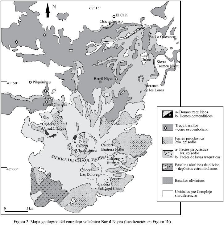 El complejo volcánico Barril Niyeu (sierra de Chauchaiñeu, Figura 1b) es una estructura integrada por varias calderas, la principal se ubica en la parte central con ~5 km de diámetro (Caldera Chauchaiñeu, Figura 2). Se asocian otras cinco calderas de aproximadamente 24 km de diámetro vinculadas a la erupción de coladas traquíticas, flujos piroclásticos y domos comendíticos (Salani et al., 2005, 2006).