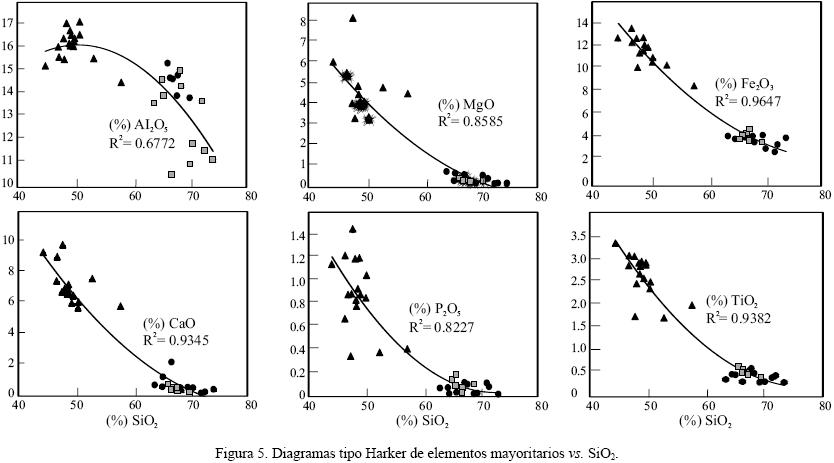 La correlación de los elementos mayores con SiO2 (Figura 5) apoyaría una evolución de la serie por cristalización fraccionada. La distribución de MgO, CaO y la relación CaO/Al2O3 son coherentes con un conjunto de fraccionamiento ol + clinopx ± plag, el cual puede corroborarse en el análisis mineralógico.