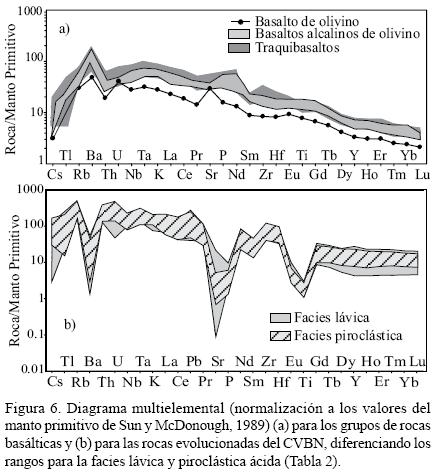 En los diagramas multielementales (Figura 6a) todos los basaltos presentan enriquecimiento en elementos incompatibles de bajo potencial iónico, con un máximo para el Ba, anomalía negativa en Th y una débil anomalía positiva en NbTa. Los traquibasaltos son los que presentan los patrones más enriquecidos.