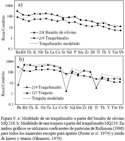 Aplicando la ecuación CL/CO=F(D1) (Neumann et al. 1954), se modeló el fraccionamiento del traquibasalto MQ219 a partir del basalto MQ218 (Figura 9a). El modelo final se obtuvo con un fraccionamiento del 35% de un conjunto mineral de 42% de clinopiroxeno, 28% de plagioclasa, 27% de olivino y 3% de óxido de hierro y titanio. Para establecer la asociación mineralógica se realizó una aproximación por balance de masa de elementos mayores y luego se corroboró por elementos traza.