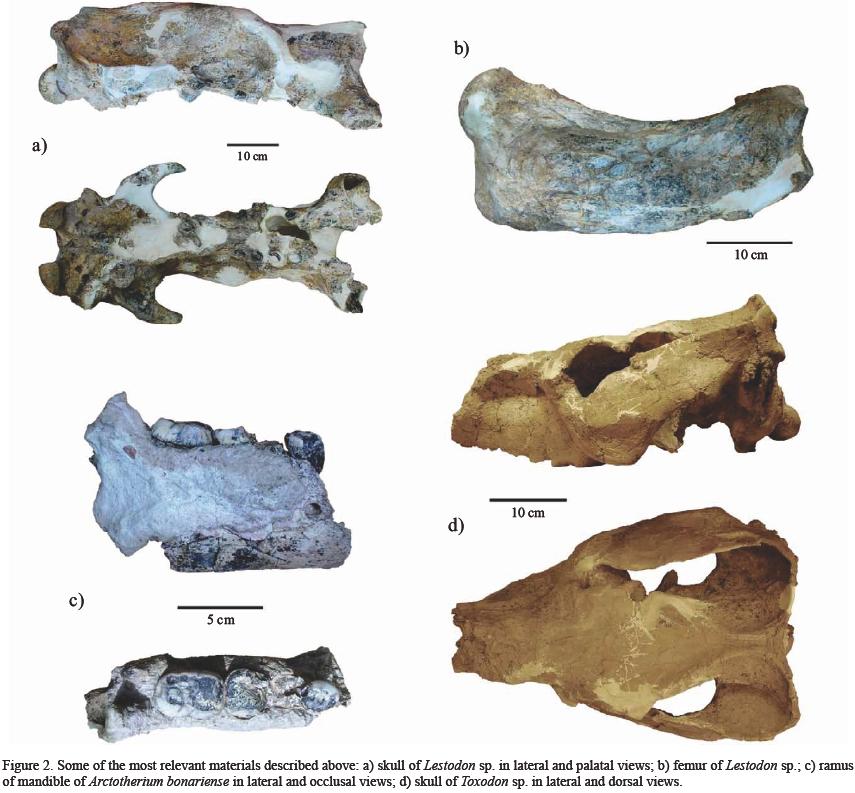 Preliminary studies of the faunal composition of the association, its chronology, paleoenvironments and processes related to the genesis of the deposit have been previously discussed (Perea et al, 2001; Marchesano et al, 2002), whereas a detailed study of the site was initiated in 2005. This site is unique in Uruguay, as it contains a high concentration of skeletal remains, most of them completely disarticulated and fragmented, although other part is very well preserved. The fauna includes characteristic taxa of the Pleistocene of southern South America: Glyptodon sp., Doedicurus sp., Panochthus sp., Neosclerocalyptus sp., Lestodon sp., Macrauchenia cf. M. patachonica, Toxodon sp., Antifer sp., Stegomastodon waringi, among others. However, our analysis of the taphonomy of the deposit suggests that the constituent elements of the assemblage do not represent a single community.