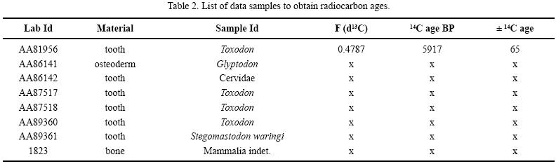 The number of skeletal elements of this association is high, but the fragmentary nature of most of them do not allow a determination to a specific level (Appendix). However, the bonebed does not consist of taxa with stratigraphic or chronologic range restricted to a single Quaternary chronostratigraphic unit (sensu Cione y Tonni, 2005). Stegomastodon waringi andArctotherium bonariense are restricted to the BonaerianLujanian stages (late middle Pleistoceneearly Holocene). It is noteworthy that from dental enamel of Toxodon a new age was obtained for this local fauna: 5917 ± 65 years BP. This one and that performed by Gutiérrez et al. (2005) were the only data obtained in the context of a lot of failed analysis and cannot be considered indicative of the true age of the bonebed (Table 2).
