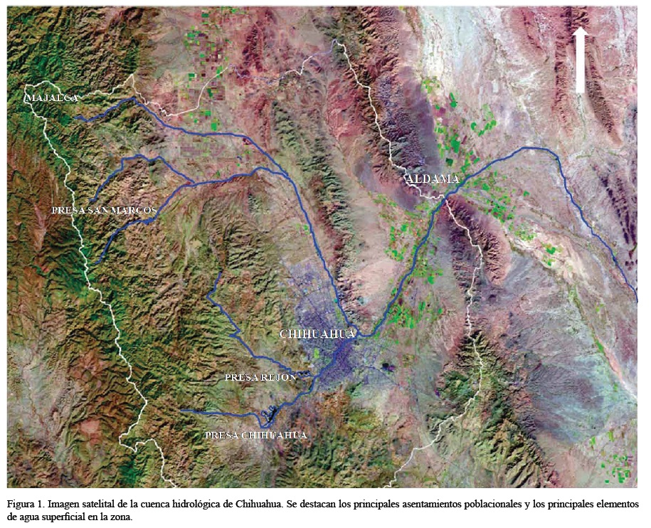 El valle de Chihuahua es una franja de terreno de 8 km de ancho por unos 32 km de largo, orientada de norte a sur, que forma parte de la cuenca hidrológica de Chihuahua (Figura 1), y de la que se extrae casi la totalidad del agua para el consumo de la ciudad de Chihuahua. La cuenca conformada por los ríos Chuvíscar y Sacramento revela dos zonas en las que se han encontrado rocas con contenidos anómalos de minerales radiactivos: la sierra de Pastorías al sur-suroeste y la zona de San Marcos-Majalca al noroeste de la ciudad (Goodell, 1985). En esta última zona se realizó el presente estudio, con el objetivo de explicar la distribución del uranio en agua superficial y subterránea, así como en los estratos del acuífero en el noroeste de la ciudad de Chihuahua.