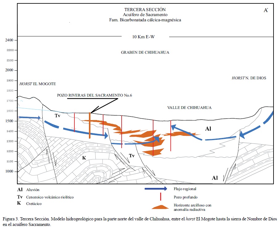 Con base en la información obtenida del estudio litoestratigráfico de los barrenos, y de los registros eléctricos de otros pozos proporcionados por la JCAS, así como la información proporcionada por la CNA, se ha diseñado un modelo hidrogeológico sobre la sección vertical AA' que corre desde las estribaciones de la sierra de Victorino-Majalca al poniente, hasta las estribaciones de la sierra de Nombre de Dios al oriente (ver Figuras 2 y 3). En los barrenos de perforación de pozos profundos se detectaron capas de sedimentos arenosos-arcillosos con anomalías en la radiactividad. Aunque las concentraciones no han sido las suficientes para identificar variedades mineralógicas por métodos convencionales, la radiometría indica anomalías en algunos de los estratos areno-arcillosos (ver por ejemplo las profundidades a 60, 130 y 190 m en el pozo Torreoncillos, así como las que se encuentran a 4, 154, 206 y 236 m en el pozo RS6 en la Tabla 3). Los tramos anómalos presentaron contenidos variables de material carbonoso-bituminoso, que indica que pudieron ser sedimentos de planicie de inundación o paleo-suelos (Tabla 3). El método de muestreo de estas esquirlas de barrenación en ocasiones puede mezclar materiales de otros estratos. Por este motivo estos resultados se toman en conjunto como indicios de captación de uranio en su estado reducido por los horizontes que presentan contenido de material carbonoso-bituminoso: