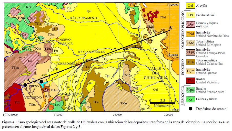 Por otra parte, en un análisis realizado por la Universidad de Texas en El Paso (UTEP) se encontraron valores elevados de uranio contenidos en un acuífero del área de Tabalaopa-Aldama (Rodríguez-Pineda, 2000). Al realizar un estudio estadístico, aplicando discriminación multivariada para determinar el origen del elemento radiactivo, se encontró que el uranio proviene del agua de recarga del río Chuvíscar, así como de la recarga lateral generada por los abanicos aluviales que descienden de las sierras circundantes (Rodríguez-Pineda, 2000). En 2003, se reiniciaron estudios para determinar el origen de la contaminación radiactiva en dicha área (Rentería-Villalobos et al., 2005; Reyes-Cortés, 2005; Silva-Sáenz, 2008).