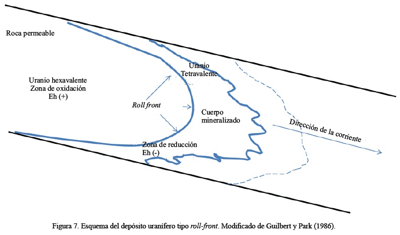 La naturaleza y la abundancia del material carbonoso en la secuencia sedimentaria por donde circulan las soluciones, son de importancia crítica. En las areniscas pobres en materia orgánica, se ha demostrado que la presencia de gas H2S es capaz de ejercer la función reductora para el uranio (Gascoyne, 1992). En consecuencia, la movilidad y la concentración de uranio está fuertemente controlada por las condiciones de reducción-oxidación del área. Los depósitos de uranio alojados en areniscas se definen como acumulaciones epigenéticas que ocurren en formaciones de origen fluvial, lacustre o deltaico. La forma de estos depósitos tiende a ser tabular o del tipo roll-front (Figura 7) (Harshman, 1970; Harshman, 1972; Guilbert y Park, 1986). Cada una se relaciona con procesos geoquímicos particulares en donde las aguas subterráneas con baja concentración de uranio se infiltran en las areniscas.