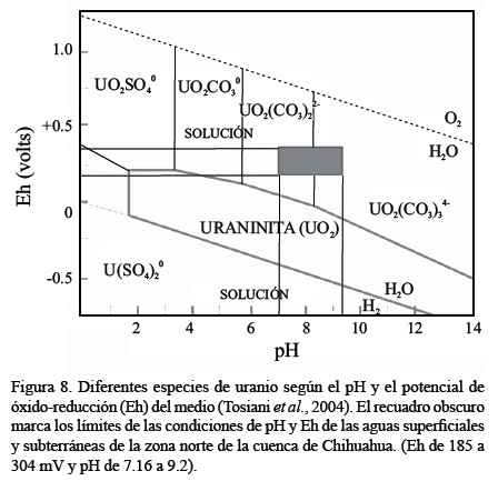 Las Figuras 7 y 8 presentan el transporte del uranio en forma acuosa y su depósito como uraninita de acuerdo con el ambiente de reducción-oxidación y su pH según Tosiani et al. (2004). De acuerdo con esta gráfica, el campo bicarbonatado marcado por los límites de Eh (entre 0.185 y 0.304) y pH (entre 7.16 y 9.20) obtenidos para las aguas del área en estudio, es favorable para la disolución y transformación del uranio tetravalente en uranio hexavalente.