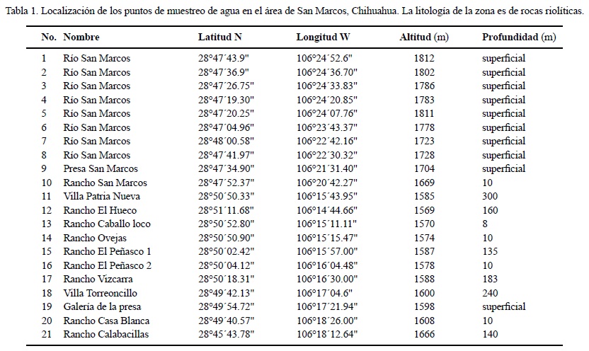En abril de 2010, además de tomar las muestras en los mismos afloramientos, se incluyeron muestras de agua en la desembocadura principal del río a la presa y en la tercera sección. Todas las muestras de agua se colectaron para análisis radiométricos. La localización de todos los puntos de muestreo de agua se presenta en la Tabla 1.
