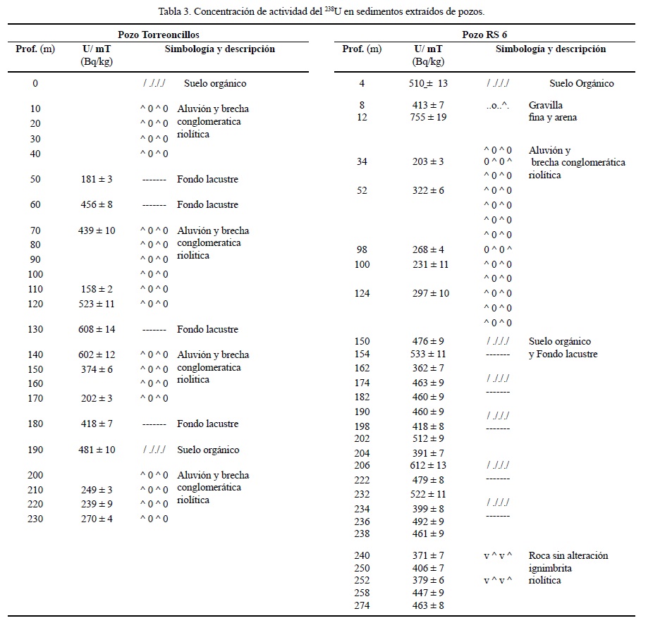 La concentración de actividad de uranio en muestras de esquirlas de barrenación de varios pozos se presenta en la Tabla 3. Los valores por encima de 450 Bq/kg de 238U/ masa total, coinciden aproximadamente con los horizontes areno-arcillosos considerados como fondos lacustres o suelos orgánicos.
