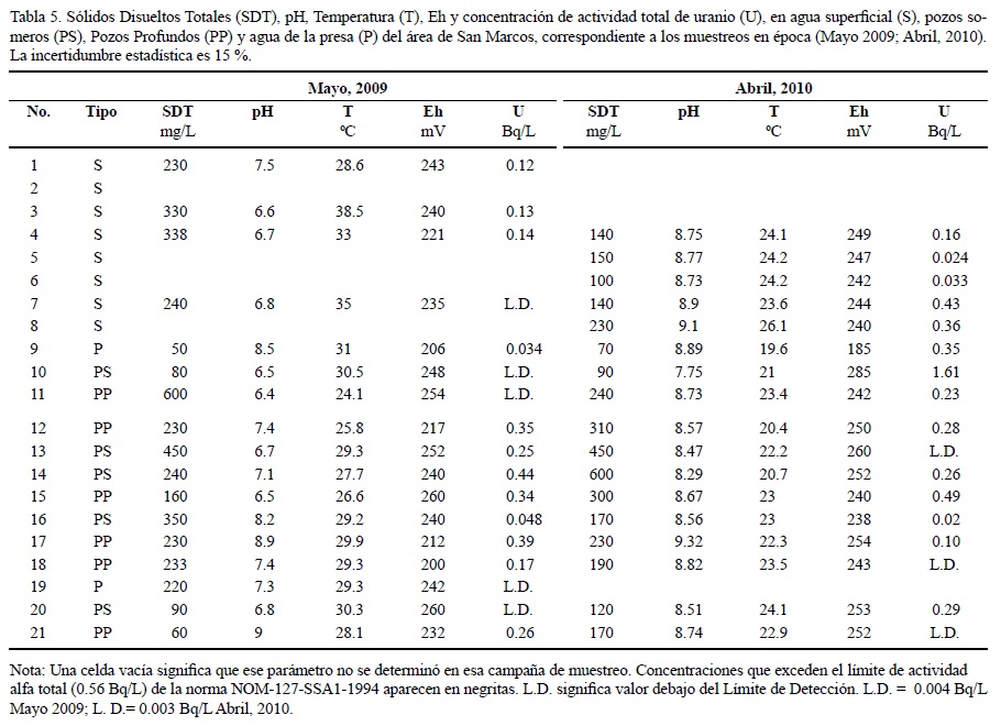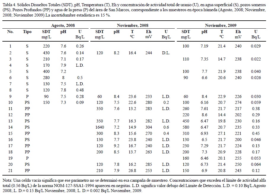 La primera ocasión en que se muestreó agua en el área de San Marcos fue en mayo de 2005 (Rentería-Villalobos et al., 2007), al final de una de las sequías más prolongadas en los últimos 50 años, con un volumen mínimo de embalse en la presa. Se obtuvieron valores de concentración de actividad del 238U de 7.7 Bq/L en aguas de la presa San Marcos. Esta concentración de actividad del 238U del agua, por compararla con una referencia, está cercana al límite superior del intervalo del agua potable que se reporta en UNSCEAR (2008) en Argentina y solamente es superado por Finlandia en el referido reporte de las Naciones Unidas. Dicha concentración de actividad de 238U del agua supera los valores establecidos por la norma mexicana para agua de consumo humano igual a 0.560 Bq/L de actividad alfa total (SSA, 2000), entre la que se encuentra la actividad alfa del uranio.