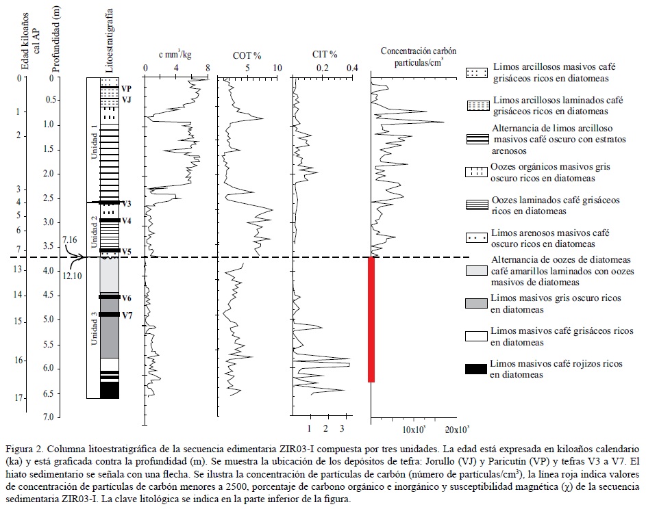 La estratigrafía del núcleo en estudio fue descrita por Ortega et al. (2010) quienes dividen la secuencia sedimentaria en tres unidades litoestratigráficas y reportan la presencia de siete tefras volcánicas (VJ, VP y V3-V7) (Figura 2). La Unidad 3 abarca de 6.61 a 3.72 m (17-12.10 ka) está compuesta por limos masivos rojizos y grisáceos ricos en diatomeas; la Unidad 2 de 3.72 a 2.57 m (7.2-3.9 ka) está caracterizada por oozes de diatomeas, ricos en materia orgánica. Estos oozes presentan coloraciones cafés oscuras a grises y están laminados en la parte inferior de la unidad, mientras que en la parte superior estos oozes son masivos. La Unidad 1 de 2.57 a 0 m (3.9 ka - 2003 AD) se compone principalmente por limos arcillosos masivos que pueden presentar diatomeas. En esta unidad se registra el depósito de tefras provenientes de los volcanes Jorullo (VJ) y Paricutín (VP). La tefra VJ está representada por material volcaniclástico diseminado, compuesto por vidrio, plagio-clasas y minerales máficos, mientras que la tefra VP está compuesta principalmente por vidrio angular, plagioclasas rotas y cristales máficos (Ortega et al., 2010).