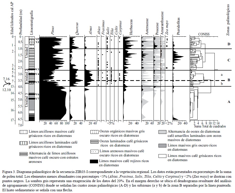 Un núcleo de sedimento (ZIR03-I) de 6.61 m de largo, extraído de la zona litoral norte del lago Zirahuén, Michoacán, abarca los últimos 17 ka y presenta un hiato entre 12.1 a 7.16 ka. A través del análisis palinológico de los sedimentos del núcleo se documentan los cambios ocurridos en las comunidades de plantas mientras que los datos de suceptibilidad magnética, carbono orgánico total, carbono inorgánico total y micropartículas de carbón obtenidos se utilizan como indicadores paleoambientales e indicadores de las condiciones paleohidrológicas y periodos de incendios. El registro palinológico indica que entre 17 y 13.5 ka la vegetación regional estuvo dominada por bosques de Pinus y la vegetación local por abundantes micro y macroesporas del helecho subacuático Isoetes t-1 indicando condiciones ambientales frías y de poca humedad. Se registra hacia ca. 13.5 ka un cambio hacia condiciones más húmedas, caracterizado por el incremento de Alnus y Quercus y la reducción en los valores de Isoetes t-1. Otro periodo de humedad se detecta entre 7.1 a 3.7 ka con el aumento de elementos del bosque mesoftico. La relación entre la vegetación terrestre en particular con elementos de disturbio y el conjunto de herbáceas se estableció con el análisis de correspondencia canónica, con las partículas de carbón e incrementos en la suceptibilidad magnética. Las condiciones eutróficas en el sistema lacustre se infieren a través de la presencia de las algas Staurastrum y Coelastrum, sugiriendo incrementos en el aporte de nutrientes al lago. La presencia de polen de maíz a ca. 3.5 ka indica el comienzo de la actividad humana alrededor del lago y se correlaciona con aumentos en las comunidades herbáceas.