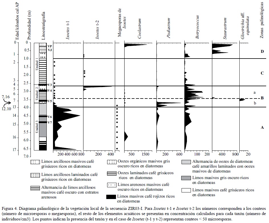 Esta zona está dividida en dos subzonas (B-a y B-b) e incluye el hiato sedimentario que abarca de 12.1 a 7.16 ka. El registro regional de la subzona B-b (3.98 a 3.49 m; 12.66.78 ka) está caracterizado por elementos arbóreos como Pinus, Quercus, Alnus, Abies, Salix, Tilia y Celtis; siendo los primeros tres los elementos más abundantes (Figura 3). Al final de la subzona (3.49-3.45 m) el polen de Pinus disminuye y hay incremento en los porcentajes de Quercus y Alnus. Las herbáceas están representadas principalmente por Poaceae y Asteraceae. En el registro local hay una disminución drástica en la concentración de microesporas de Isoetes t-1, aunque todavía se registran megaesporas de este taxón (Figura 4). Dentro del grupo de las microalgas los taxa que presentan las concentraciones más altas son Pediastrum y Botryococcus y en menor concentración se registra Coelastrum. Gloeotrichia aff. equinulata, aparece a los 6.9 ka. El registro palinológico terrestre de la subzona B-a (3.45-2.69 m; 6.78-4.3 ka) se caracteriza por el incremento en los porcentajes de Quercus y Alnus mientras que Pinus alcanza los porcentajes más bajos (<5%) en todo el registro. La comunidad de herbáceas, caracterizada principalmente por polen de Asteraceae, Poaceae y Amaranthaceae, presenta diferentes fluctuaciones en sus porcentajes (Figura 3). En el conjunto local ya no están presentes las megaesporas de Isoetes t-1 y la concentración de microesporas disminuye. Hacia el final de la zona entre 5 y 4.3 ka se registran mi-crosporas de Isoetes t-2 que probablemente corresponden a otra especie. Gloeotrichia aff equinulata desaparece y el conjunto de microalgas esta caracterizado por la presencia abundante de Botryococcus (Figura 4).