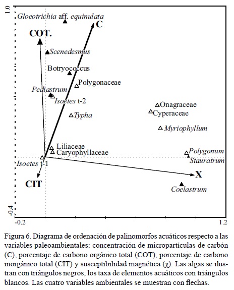 Los datos del ACC obtenidos para el registro local explicaron el 94% del total de la varianza en los dos primeros ejes. El primer eje contribuyó con el 76% de la varianza, con coeficientes de regresión positivos entre la χ, el COT, la concentración de micropartículas de carbón y los palinomorfos acuáticos (0.9846; 0.0519 y 0.0766 respectivamente). Mientras que el CIT presentó un coeficiente de regresión negativo (-0.0866) con los palinomorfos acuáticos. El eje 1 (Figura 6) está indicando el aporte de agua al lago, con valores positivos representando mayor ingreso de agua y posiblemente aumento de nutrientes que siguieren eutroficación con la presencia de Coelastrum y Staurastrum, mientras que los valores negativos indican menor ingreso de agua con la presencia de Isoetes t-1. Por otro lado, el segundo eje, contribuyó con el 18% de la varianza explicada. En este eje, el COT, el CIT y la concentración de micropartículas de carbón mostraron coeficientes de regresión positivos (0.4196; 0.0724 y 0.7455 respectivamente) a diferencia de la χ que mostró un coeficiente de regresión negativo de -0.2240. El eje 2 parece estar relacionado con el nivel trófico del lago donde los valores negativos indican eutroficación y los positivos la existencia de un sistema oligotrófico. Los resultados del CCA, de acuerdo a los valores de t, sugieren que las cuatro variables ambientales (χ, COT, CIT y micropartículas de carbón: 217,899; 10,043; -19,536; 15,215, respectivamente) explicaron los patrones de distribución de los palinomorfos acuáticos en el eje 1, mientras que en el eje 2, sólo tres (χ, COT y micropartículas de carbón) de éstas fueron importantes (Figura 6).