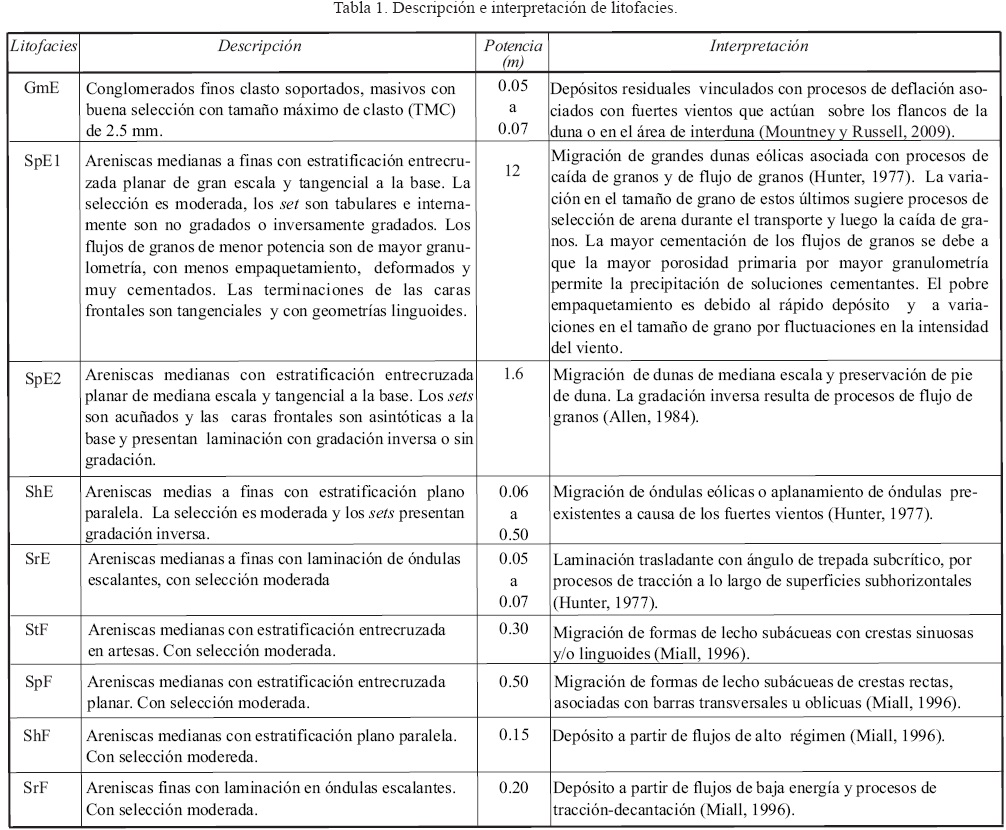 Interpretación. Las litofacies presentes en este elemento caracterizan a ambientes de depósito por migración de óndulas eólicas en áreas de interduna (Ahlbrandt y Fryberger, 1981; Mountney, 2006). Los límites netos y planos se interpretan como superficies de truncamiento debidas a procesos de deflación o a la propia dinámica de migración y superposición de diferentes sistemas de dunas. La ausencia de rasgos pedogenéticos y la escasa presencia de bioturbación permiten interpretar condiciones secas para este ambiente de interduna.