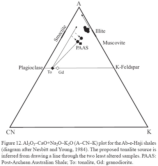 which is useful for evaluating and correcting the effects of K-metasomatism and for giving some information of the composition of the fresh source rock (Nesbitt and Young, 1984; Fedo et al., 1995). Plots of Ab-e-Haji samples on these diagrams show two different trends (Figure 12). The first one (samples with CIA values of 80 to 83) follows a trend towards the A-apex (near the illite composition), which indicates a high degree of alteration (Cingolani et al., 2003).