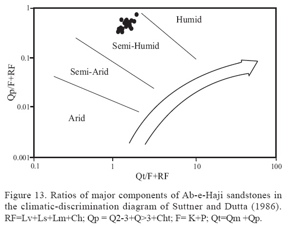The characteristics of clastic grains (Kutterolf et al., 2008), such as major components ratios, and the climatic-discrimination diagram (Suttner and Dutta 1986) suggest a dominance of semi-humid climatic conditions for the source area of the Ab-e-Haji sandstones (Figure 13). This is in agreement with moderate to high values of weathering indexes, calculated from geochemical analysis. Moreover, the semi-humid climate, inferred from the composition of Ab-e-Haji sandstones, is supported by the presence of scattered coal seams in the studied section and from the paleogeographic location of central Iran , including the Tabas block, nearly above N30° during Jurassic times (Golonka and Ford, 2000).