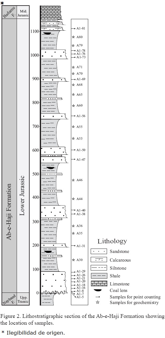 Estudios petrográficos de areniscas y geoquímica de lutitas de la Formación Ab-e-Haji del Jurásico Inferior, perteneciente a la parte sur del bloque de Tabas en Irán central, se emplearon para constreñir la proveniencia, ambiente tectónico y condiciones de intemperismo. Las areniscas están constituidas principalmente por cuarzo y fragmentos líticos sedimentarios y metamórficos de bajo grado y, por lo tanto son de naturaleza cuarzolítica (Qm38-F2-Lt60, Qt58-F2-L40). Sin embargo, el análisis modal, con presencia de líticos muy inestables, de la Formación Ab-e-Haji indica poco transporte de los componentes de las areniscas desde un cinturón de pliegues y cabalgaduras a la cuenca de antepaís. Diagramas de discriminación basados en el contenido de elementos mayores y traza indican la participación de fuentes recicladas en el depósito de la Formación Ab-e-Haji, las cuales, en la parte superior de la sección , fueron probablemente mezcladas con una fuente félsica menor. anomalías negativas de Eu, similares a las que presentan la Lutita Australiana Post-Arqueana (PAAS, por sus siglas en ingles), asi como el empobrecimiento en Ca, Na, Cs, Ba y Rb y una baja relacion de K2O/Al2O3 en las lutitas estudiadas, sugiere una baja abundancia de feldespato en la fuente. El empobrecimiento en los metales de transición (Cu, Sc, Ni, Cr y V) puede explicarse por la derivación de una fuente más sílicica y fraccionada que la PAAS. Además, de acuerdo con el diagrama de La-Th-Sc y las relaciones La/Sc, Th/Cr y Th/Sc, los sedimentos de la Formación Ab-e-Haji están dentro del rango de sedimentosfinos derivados de fuentes silicicas. Los patrones de elementos de las tierras raras (REE) normalizados a condrita son similares a los de la PAAS, con enriquecimiento de tierras raras ligeras (LREE), anomalía negativa de Eu y un patrón casi plano de las tierras raras pesadas (HREE), características similares a las de rocas fuente con componentes felsicos y (meta)sedimentarios. Se interpreta que el desplazamiento de fallas intracuenca, como la falla de basamento activa Kuh-Banan, y la exposición de sucesiones supracrustales (cinturón de pliegues y cabalgaduras), constituyeron un área fuente mixta que aporto sedimentos a la cuenca de antepaís Ab-e-Haji. Esta actividad tectónica pudo estar relacionada con la orogenia Eo-Cimmeriana en Iran central durante el Tirásico tardío al Jurásico. Por otra parte, los datos del conteo de puntos en areniscas de la Formación Ab-e-Haji apunta a condiciones climática semihúmedas, lo cual es respaldado por los valores del índice químico de alteración de las lutitas de esta formación , los cuales indican intemperismo moderado a intenso de las rocas parentales en el área fuente.