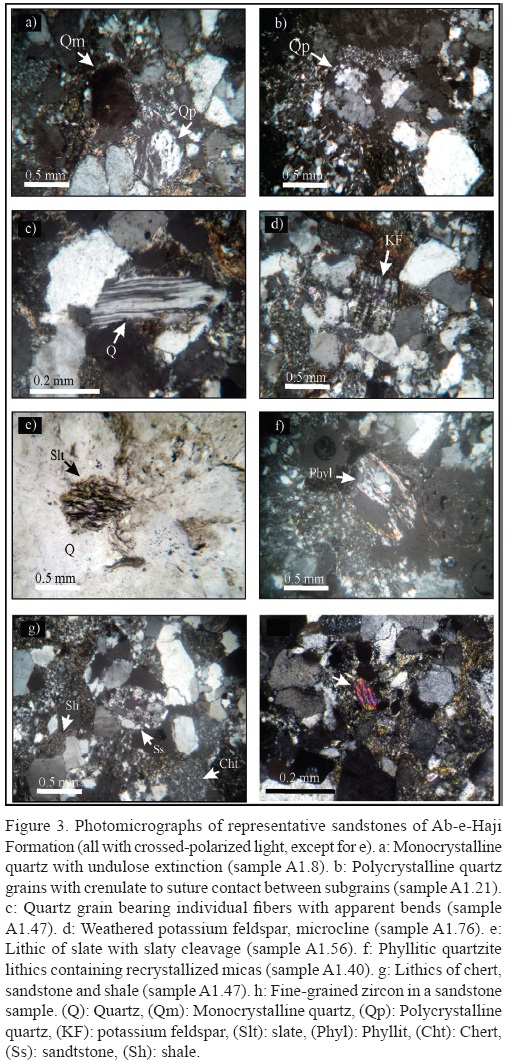 The Ab-e-Haji sandstones contain a considerable amount of rock fragments including metasedimentary and sedimentary types. The metamorphic rock fragments are metapelite grains, dominantly slate grains with slaty cleavage (Figure 3e) and phyllitic quartzite lithics containing re-crystallized micas in preferred planar orientation (Figure 3f) (Dorsey, 1988). Sedimentary lithics are mostly shale, chert and sandstone (Figure 3g). Moreover, fine to very fine zircon and tourmaline grains were observed in these deposits (Figure 3h).