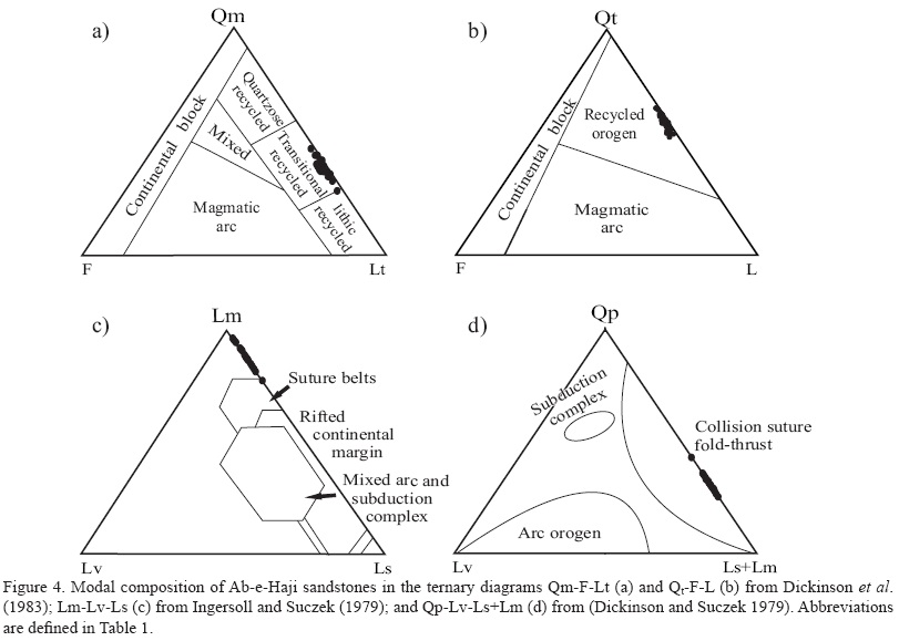 Furthermore, diagrams based on the proportion of lithic fragments (Lm 86.97-Lv0- Ls13.03, Qp33.58-Lvm0-Lsm72.09) (Ingersoll and Suczek, 1979; Dickinson and Suczek 1979) indicate the evolution of a suture tectonic zone and growth of fold-thrust belts in provenance terrain of Ab-e-Haji depositional basin (Figure 4c, 4d). Such a provenance tectonic setting can be consistent with the Eo-Cimmerian orogenic phase related to central Iran -Eurasia continental collision at the end of the Triassic. In addition, labile fragments derived from a fold-thrust belt could deposit in a nearby foreland basin as already mentioned by Aghanabati (2004) for the depositional basin of the Shemshak Group (comprising the Ab-e-Haji Formation).
