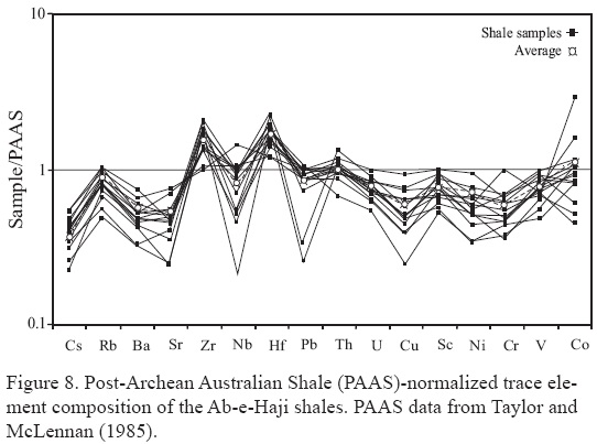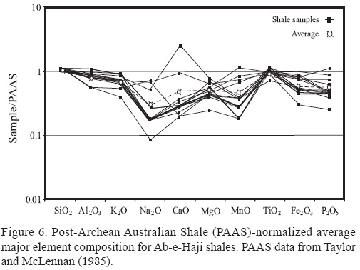 In comparison with Post-Archean Australian Shale (PAAS; representative continentally derived sediments) (Taylor and McLennan 1985), Ab-e-Haji shales show strongly depletion in constituents like Na2O (0.3 times PAAS), CaO and MgO (0.5 times PAAS), and are moderately depleted in K2O (0.7 times PAAS) and Al2O3 (0.8 times PAAS) (Figure 6).