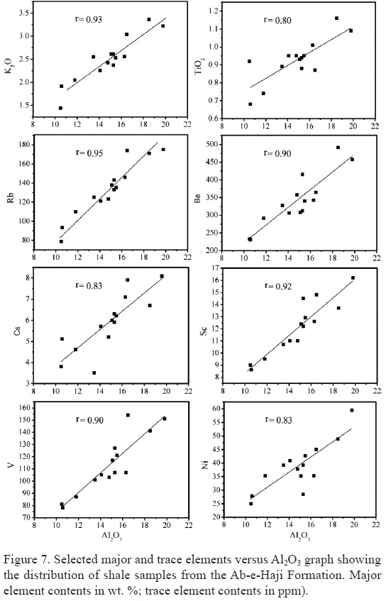 The Index of Compositional Variability, ICV= (Fe2O3+K2O+Na2O+CaO+MgO+TiO2)/Al2O3) and the K2O/ Al2O3 ratio (Cox et al., 1995) of fine siliciclastic rocks can be used to quantify the compositional maturity. In general, the ICV value lower than one for the Ab-e-Haji samples (average=0.63) indicates a tectonically quiescent environment, where recycling and weathering are active (Weaver, 1989; Joo et al., 2005).