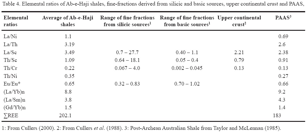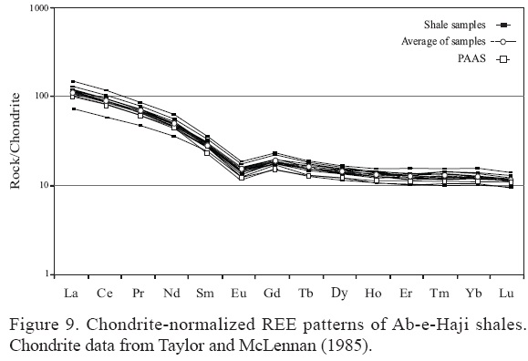 Chondrite-normalized REE abundances and patterns in Ab-e-Haji samples are generally similar to those of PAAS, which implies homogenization of these sediments (LREE enrichment, flat HREE and negative Eu). The europium anomaly 0.60 to 0.69 (average 0.65) indicate strong depletion of europium relative to neighboring rare earth elements, typical for PAAS as evidence for differentiated parent rocks (Taylor and McLennan, 1985). Furthermore, the high LREE/HREE ratio (8.48) of Ab-e-Haji shales is characteristic of felsic source rocks (Taylor and McLennan, 1985; Wronkiewicz and Condie, 1989, Cullers, 1994b).