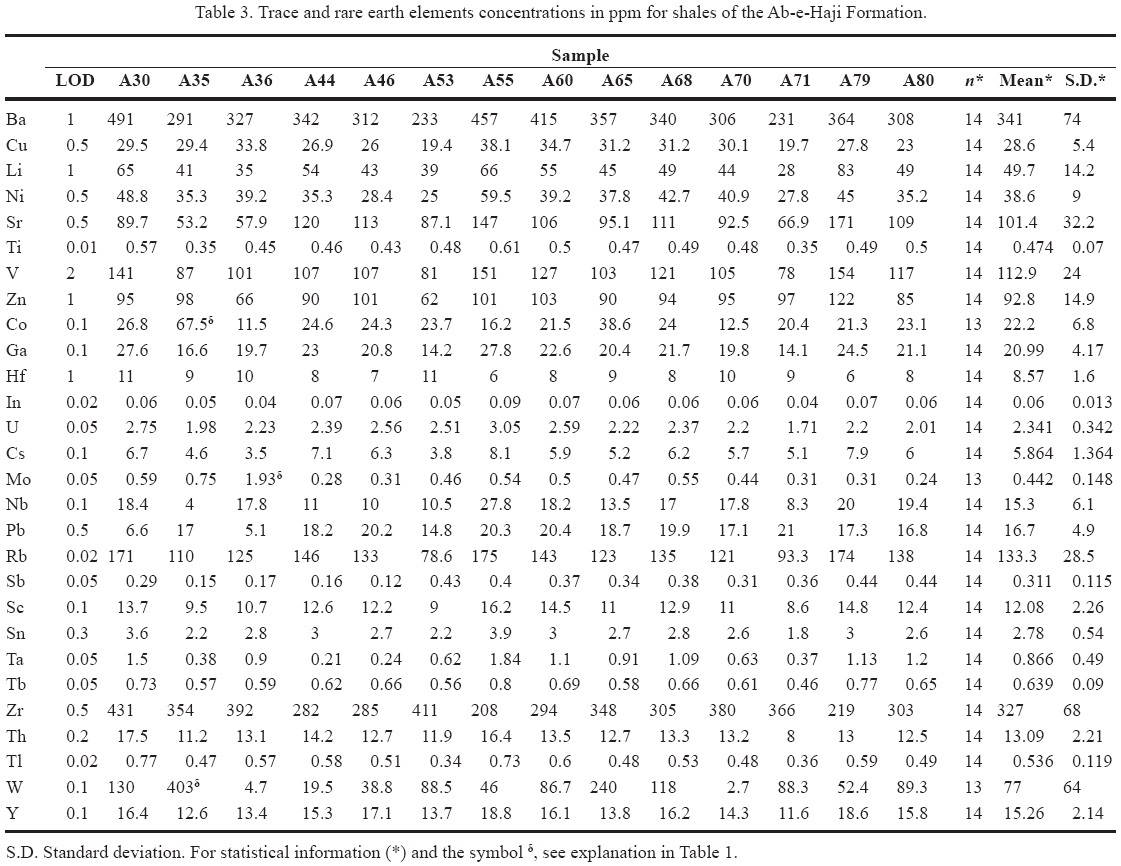The compositional data for major and trace elements including rare earth elements (REE) for fourteen shale samples from the study area are listed in Tables 2 and 3. Also included in these tables are the lower limits of detection (LOD) data for these elements. Many of the LOD values (Table 3) are consistent with the quality parameter of odd-even effect proposed by Verma et al. (2002) and Verma and Santoyo (2005). In fact, these LOD values should be estimated to at least two significant digits as suggested by these authors. Nevertheless, the LOD values give an indication of the quality of major and trace element data presented in this work.