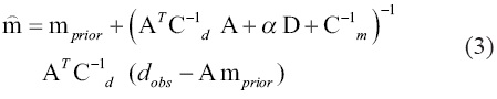 Suponiendo que asociado a cada dato tenemos una estimación de su error σi (i =1,..., N) y que los errores son estadísticamente independientes, incluimos la incertidumbre en los datos en la diagonal principal de su matriz de covarianza, Cd = σiI. Proponemos a priori un modelo inicial, mprior, que consiste en una estimación de la densidad en cada uno de los estratos que constituyen el cuboide, y una estimación de su incertidumbre σj (j =1, M), la cual se incluye en la matriz de covarianza del modelo, Cm = σjI. Adicionalmente, buscamos una solución cuya variación espacial sea suave, incluyendo un operador de primera derivada, D, que actúa sobre el modelo en las direcciones x, y, z. De acuerdo con Jackson (1979) y Tarantola (2005), la solución al problema inverso lineal está dada por