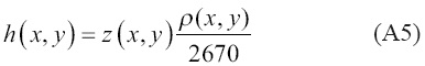 en donde h(x,y) representa la topografía (h>0) o batimetría (h<0) y w(x,y) representa la flexión producida, rm es la densidad del manto, r0 es la densidad de la topografía y rf representa la densidad del fluido que la topografía desplaza: aire en regiones continentales y agua en regiones oceánicas. Sumando a la flexión el grosor cortical al nivel del mar (Z) obtenemos la profundidad al límite corteza-manto