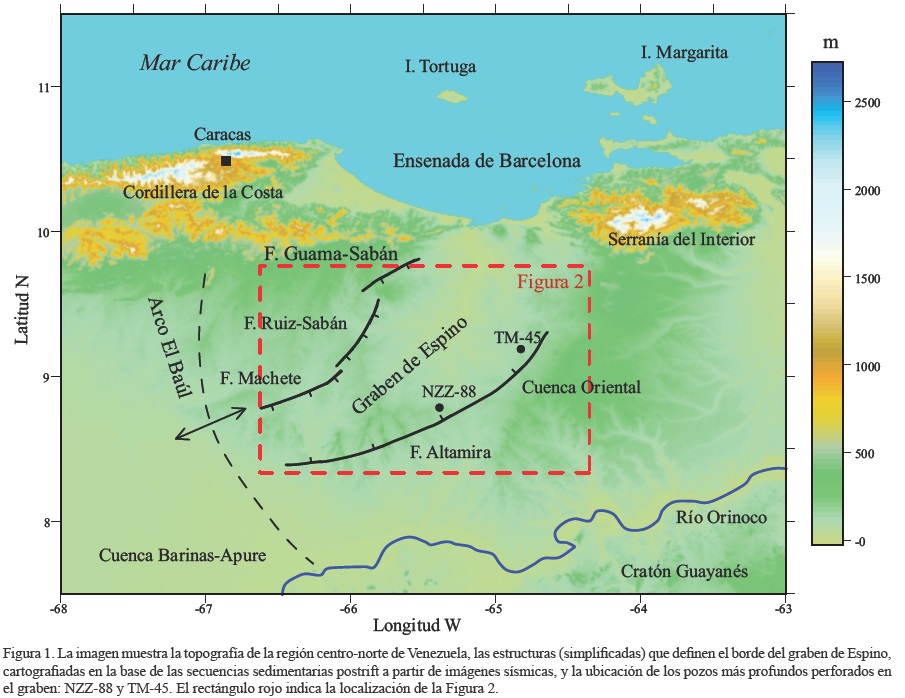 Se ha sugerido que el graben de Espino en el oriente de Venezuela (Figura 1) es un aulacógeno que se originó como un rift abortado de una unión triple RRR durante la apertura del Atlántico central en el Jurásico, con posibilidad de albergar un sistema petrolero en rocas pre-cretácicas (Burke, 1977; Moticska, 1985; Salazar-Tomey, 2006). Diversos estudios de reflexión sísmica y de estratigrafía sísmica por secuencias, aunque no alcanzan a iluminar claramente la base del graben, han mostrado que el graben de Espino se extiende en dirección NE con una longitud de unos 120 km, y está limitado hacia el noreste por las fallas Machete, Ruiz-Sabán y Guama-Sabán, que son fallas normales con deslizamiento al SE; hacia el sureste, el graben está limitado por la falla normal Altamira con deslizamiento al NW (Figura 1).