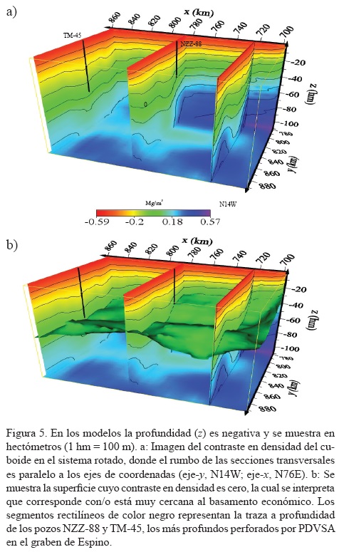 Los resultados de la inversión se presentan en las Figuras 4 y 5. En la Figura 4 se compara la anomalía de gravedad observada con la anomalía calculada mediante isolíneas, que en general se traslapan pues el desajuste es menor a ±1 mGal. En la Figura 5, la profundidad (z) es negativa y se muestra en hectómetros (1 hm = 100 m). La Figura 5a muestra cortes transversales del modelo en las direcciones x y z, donde se aprecia la variación lateral del contraste en densidad a profundidad, sugiriendo que en algunos segmentos el graben pudiera extenderse hasta ~11 km de profundidad. La Figura 5b muestra la superficie de cero contraste en densidad, la cual se interpreta como el basamento económico. Por debajo de esa superficie se incrementa la densidad, implicando que disminuyen la porosidad y la permeabilidad, y no esperamos encontrar las condiciones para el desarrollo de un sistema petrolero.