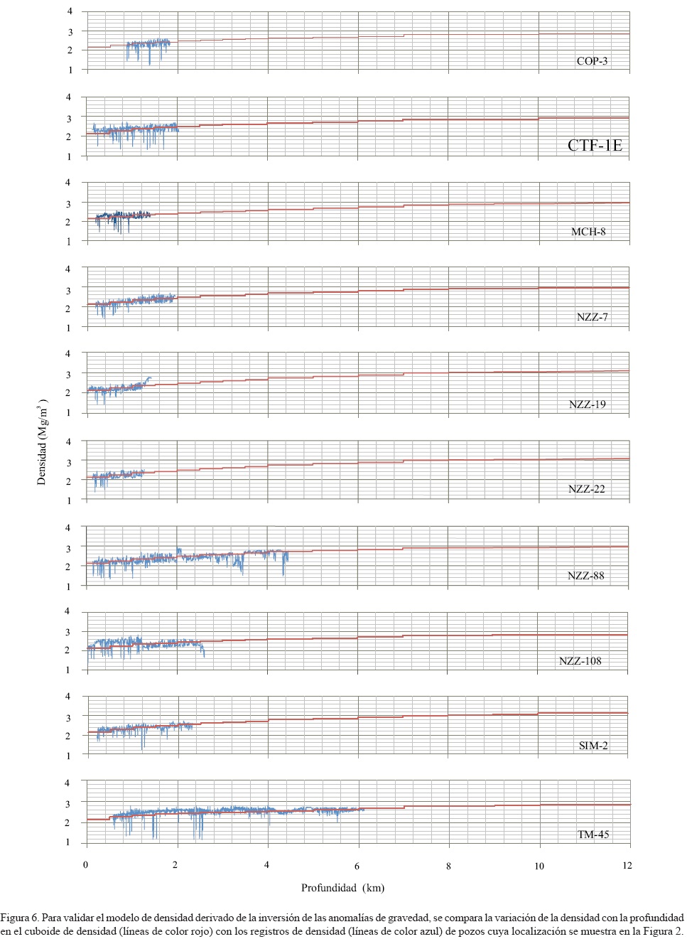 Para validar la solución al problema inverso le sumamos 2670 kg/m3 al modelo 3D de contraste en densidad para compararlo con los registros de densidad de diez pozos. El modelo 3D de densidad fue muestreado en la vecindad de los pozos para obtener perfiles verticales de densidad comparables con los registros de densidad que se observan en la Figura 6. Esta comparación muestra que la densidad del modelo 3D es comparable en magnitud y tendencia en profundidad con los registros de densidad.