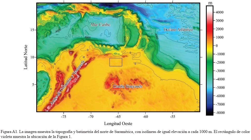 La topografía y batimetría del norte de Suramérica se muestra en la Figura A1. Los principales rasgos fisiográficos en el occidente de esta región son los Andes de Colombia y Venezuela que alcanzan alturas de más de 5000 m sobre el nivel del mar (SNM), el cratón de Guayana cuya altura se incrementa de oriente a occidente desde ~500 a 2000 m s.n.m., y en el norte de Venezuela, la Cordillera de la Costa y la Serranía del Interior que alcanzan alturas de hasta ~1500 m s.n.m. La región de los llanos de Colombia y Venezuela está caracterizada por tierras bajas cuya elevación es en general menor a 200 m s.n.m.. Fuera de costa los rasgos más sobresalientes se encuentran en la región del Mar Caribe y en el Océano Atlántico, donde la batimetría alcanza profundidades abisales de más de 5000 m.