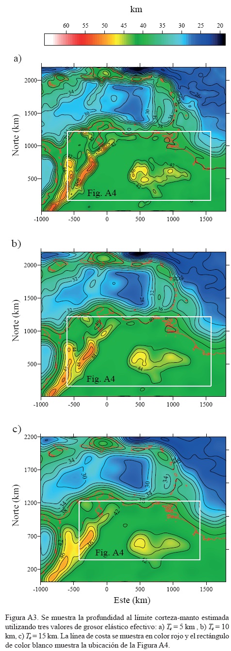 Tomando en cuenta las inferencias de la profundidad al límite corteza-manto en Venezuela reportadas por Schmitz et al. (2002, 2008), para la región de la cuenca Oriental se asignó un espesor cortical al nivel del mar (Z) de 40 km. Se procedió a estimar la profundidad al límite corteza-manto para la región, utilizando diversos valores de grosor elástico efectivo en la Ecuación A3; los resultados obtenidos utilizando Te = 5, 10 y 15 km se muestran en la Figura A3.