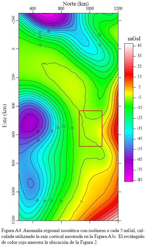 Utilizando el resultado obtenido con un grosor elástico efectivo Te = 15 km, debido a su parecido con la profundidad a la base de la corteza inferida por Schmitz et al. (2002, 2008) se calculó la anomalía regional isostática mostrada en la Figura A4, utilizando un contraste de densidad Δρ = 350 kg/m3 (positivo para el efecto de la anti raíz en regiones oceánicas y negativo para la raíz en regiones continentales), la cual se restó de la anomalía de Bouguer para obtener la anomalía de Bouguer residual isostática mostrada en la Figura 2.