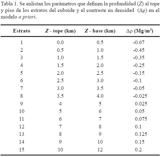 A fin de optimizar los recursos computacionales disponibles para resolver el problema inverso, las coordenadas de los datos de gravedad y de topografía fueron rotadas 14 grados en sentido horario, y se seleccionó la región rectangular de 160 por 110 km indicada en la Figura 2. El problema inverso incluye 17871 datos de gravedad distribuidos regularmente en una malla con nodos espaciados 1 km, y postulamos que la incertidumbre en los datos es de 1 mGal. La geometría del modelo del subsuelo es un cuboide que incluye 12240 prismas repartidos en 15 estratos (Me = 15) de espesor constante; cada estrato está constituido por un arreglo de Mr = 24 por Mc = 34 prismas, y la extensión horizontal de cada prisma se fijó en 5×5 km2. En el modelo a priori (Figura 3, Tabla 1), el contraste en densidad del estrato más somero se asignó considerando que en la región de estudio afloran sedimentos pobremente consolidados; a los estratos más profundos se les asignó un contraste en densidad que disminuye con la profundidad y que, a grosso modo, sigue la variación observada en los registros de densidad de los pozos perforados por PDVSA en la región.