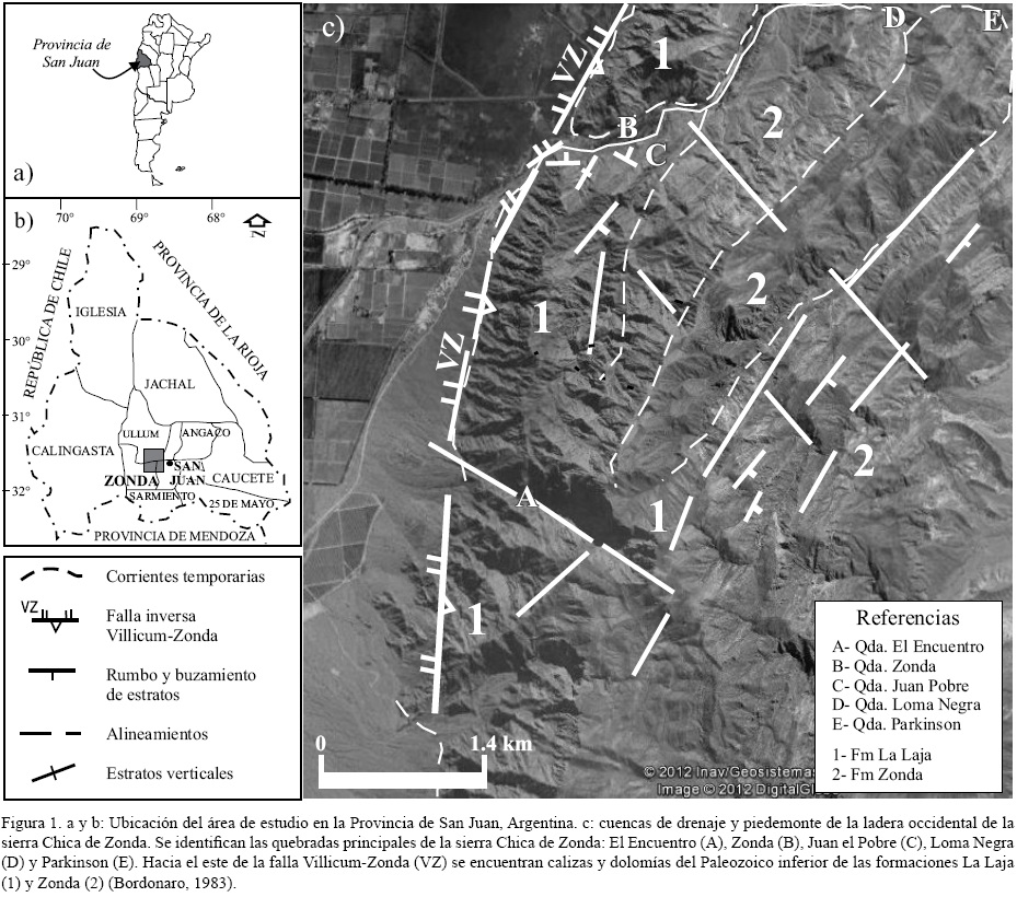 La sierra Chica de Zonda, es un relieve montañoso con altura promedio 1800 m, perteneciente a la Precordillera Oriental. Esta unidad montañosa está constituida por sierras menores de rumbo submeridional con relieves de estructuras homoclinales y plegados en forma de grandes anticlinales asimétricos al oeste, con ejes paralelos a los ejes de los cordones montañosos que la integran. Los planos axiales de estos anticlinales se inclinan al este con alto ángulo, en tanto que en la mayoría de los casos los flancos occidentales se presentan verticales, rebatidos o están suprimidos por fallas inversas de alto ángulo y rumbo predominantemente norte-sur, constituyendo el límite occidental de la Precordillera Oriental. En el sector de interés, el área montañosa o áreas de cuencas (Ac) se desarrollan entre los 1900 metros y los 960 metros, entre afloramientos de calizas del Cámbrico inferior-medio, interrumpidas por escamas carbonáticas del Ordovícico (Bordonaro, 1980), y con buzamientos variables que oscilan entre 70° E-SE a verticales. Por su parte, el área de acumulación de los depósitos de abanicos (Aa) aluviales cuaternarios se extiende entre los 960 metros y los 750 m s.n.m (Figura 2). La geología local, en las cercanías de la quebrada de Zonda, está compuesta por una secuencia cámbrica fosilífera marina (Bordonaro, 1983) de calizas, margas, lutitas y cuarcitas. Los términos más antiguos aflorantes en la región están datados por el contenido fosilífero del Cámbrico inferior, constituyendo la base de los 2500 m de carbonatos de plataforma cambro-ordovícica de las Formaciones La Laja, Zonda, La Flecha y San Juan (Gardini, 1993) (Figura 1). En el área, los afloramientos de la Fm. La Laja ocupan la mayor extensión con una variedad de relieves locales de estructuras plegadas y monoclinales, detalladas más adelante (Figuras 1 y 2).