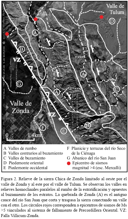El área de interés se ubica al pie del sistema de fallamiento regional Villicum-Zonda (VZ) en el límite occidental de Precordillera Oriental (Figuras 1 y 2). La región se encuentra bajo la influencia de la subducción subhorizontal de la placa de Nazca por debajo de la Sudamericana (Alvarado et al., 2007, 2009). Esto origina la migración hacia el este del frente orogénico, con ausencia de volcanismo actual, elevada sismicidad de intraplaca y numerosas evidencias de actividad tectónica cuaternaria (Ramos et al., 1986; Costa et al., 2000). La subhorizontalización de la placa de Nazca se habría iniciado entre los 8 y 10 Ma (Jordan y Gardeweg, 1987; Kay et al., 1991), y si bien se registran cuantiosos sismos a profundidades cercanas a los 100 km que delinean la posición de la placa y que se correlacionan con la subducción de la dorsal Juan Fernández (Alvarado et al., 2007, 2009), los principales terremotos destructivos se ubicaron a profundidades menores y están relacionados con las estructuras que deforman los depósitos cuaternarios. La falla regional Villicum-Zonda (VZ), que limita el borde occidental de la sierra Chica de Zonda, es una falla profunda que involucra al basamento y lo eleva cerca de la superficie (Gardini, 1993). Por su parte Smalley (1988) registra la actividad sísmica indicando que los hipocentros se ubican a profundidades variables entre 20 y 30 km. Ruzycki de Berenstein et al. (1989) asocian a este sistema varios sismos con magnitudes (Ms) superiores a 5, algunos de ellos profundos y otros superficiales. Estos autores indican uno ocurrido en febrero de 1978 con Ms= 5.7 a una profundidad de 19 km. La actividad del sistema está registrada en datos del Instituto Nacional de Prevención Sísmica (INPRES-San Juan), analizados por Castano (1993), quién vincula el epicentro del terremoto del 11 de Junio de 1952, de magnitud Ms= 7.0, con este sistema. Todo ello sumado al alto ángulo de la falla (70° E), su persistencia longitudinal en más de 200 km, indicarían que el basamento de la Precordillera Oriental es mecánicamente activo y que la falla Villicum-Zonda (VZ) es profunda afectando al basamento y elevándolo cerca de la superficie. Según Bastías (1986) este sistema de fallamiento posee un rango de levantamiento de 0.6 mm/año. En la región de la Figura 2 se han incorporado dos epicentros vinculados al fallamiento de Precordillera Oriental con magnitudes superiores a cinco (datos sísmicos del INPRES, 2006).