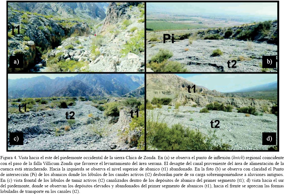 En el territorio sanjuanino la mayoría de los piedemontes son largas fajas pedemontanas de dirección meridional que acompañan a los sistemas serranos precordilleranos. El sistema de fallamiento inverso de Villicum Zonda, borde oeste de Precordillera Oriental, genera piedemontes asimétricos en ambos flancos, siendo el occidental de menor desarrollo y mayor pendiente que el oriental. Las unidades geomorfológicas delimitadas en el piedemonte occidental de la sierra Chica de Zonda van desde abanicos aluviales, canales actuales y activos ocupados con lóbulos de tamiz hasta abanicos aterrazados (Figuras 3, 4 y 5).