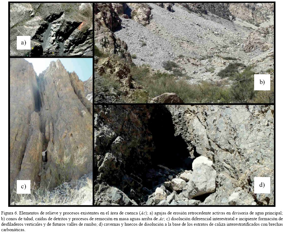 El análisis del relieve de la sierra Chica de Zonda muestra una gran diversidad de relieves en estructuras plegadas a escala local. La alternancia de estratos de caliza y marga conduce a distintas combinaciones de relieves diferenciales erosivos y de relieves monoclinales, entre los que pueden ser diferenciados desde crestones y cuestas, hogbacks hasta barras (Figuras 2, 6 y 7), en la terminología de Viers (1983). Transversalmente al rumbo de la sierra y al sur de la quebrada de Zonda, la estratificación tiene un buzamiento general hacia el ESE con un relieve monoclinal asimétrico, limitado hacia el oeste por la falla de Zonda (Figura 7). Los diferentes buzamientos de los estratos han favorecido el desarrollo de relieves de cuestas (1-10°) y crestones (10-30°) en la quebrada de Zonda. Relieves de hogbacks y barras se observan en la cercanía al frente tectónico de la falla Villicum-Zonda y en la margen derecha de la quebrada de Zonda. Esta megatraza tiene un rol importante en la formación local y regional del relieve (Figuras 2 y 7). En la quebrada El Encuentro, opuesta al buzamiento, y en la quebrada Juan Pobre la disposición de los estratos forma relieves hogback (30°-70°) y barras (70°-90°) (Figura 7). La litología de calizas altamente tectonizadas, con diaclasa-miento y alto grado de intemperización, interestratificadas con brechas tectónicas de matriz calcárea, facilitan los procesos de disolución (kárstica), erosión diferencial, cavernas, huecos, caídas de bloques y de fragmentos (Figuras 7a-7d) Asimismo, las corrientes instaladas en este relieve sedimentario carbonático paleozoico, están controladas por el rumbo y el buzamiento de los estratos. Tales son los casos de las quebradas Zonda (Z), Juan Pobre (JP) y Parkinson (P), ubicadas con rumbos NNE-SSO. Estas corrientes principales tienen 6.5 a 8 km de longitud. Son valles en dirección de rumbo en el concepto de la clasificación de Ollier (1984). Por su parte, las corrientes que drenan la ladera occidental de la sierra son valles contrarios al buzamiento, como la cuenca de la quebrada El Encuentro (EE). Esta última se desarrolla en posición perpendicular a la de JP y de P; esta ubicación propicia el desencadenamiento de procesos de captura laterales entre estas cuencas adyacentes (Figuras 2 y 6).