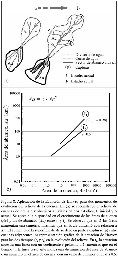 Asimismo, se efectuó un análisis morfométrico aplicando la ecuación de Harvey (1997) a las áreas de drenaje de la cuenca y de abanicos aluviales. Este último autor expresa que el área de un abanico (Aa) se relaciona directamente con el área de la cuenca (Ac) a través de un coeficiente c que puede variar entre ~0.1 y ~2.1. En este trabajo se aplicó dicha ecuación para estadios a tiempos t1 y t2, correspondiendo t1 a un tiempo inicial de la evolución del relieve en las áreas de cuenca y cuando las divisorias de agua estaban más próximas a las bocas de las quebradas y al paso de la falla VZ; mientras que t2 corresponde a las áreas de cuenca y abanicos actuales. Se apreció claramente que la evolución del relieve cuaternario, acentuado por las desnivelaciones topográficas, producto de la actividad tectónica regional y local, influyó en que las áreas de cuenca (Ac) aumentaran significativamente en relación con las de abanicos (Aa) (Figuras 8a y 8b). Las diferencias entre las rectas obtenidas en las figuras señaladas, indican claramente que el valor de la constante en esta ecuación cambia con la evolución del relieve. Estos resultados colaboraron en la interpretación y aporte brindado en las Figuras 9a y 9b, que grafican un piedemonte afectado por un fallamiento inverso que favorece el levantamiento del área montañosa, la erosión retrocedente en cabeceras y aumento en el área de las cuencas; en contraposición son el área de acumulación que mantiene su superficie pero aumenta la carga y volumen sedimentario, ante la ausencia o escasa exportación de materiales hacia afuera del sistema.