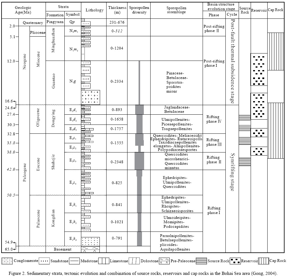 The sedimentary formations in the Bohai sea area mainly include Paleogene, Neogene and Quaternary sediments from bottom to top (Figure 2; Gong, 2004). Rift valley sedimentation is preserved in the Paleogene strata, which indicate that lake basins with lacustrine sedimentation were well developed. In the Neogene, lakes basically disappeared, and deposition was characterized by fluvial plain and shore-shallow lake environments. Quaternary strata are mainly marine deposits. According to lithologic features, the whole Cenozoic basin-filling sequence can be divided into six formations from the bottom up (Figure 2, Gong, 2004): Kongdian(E1k), Shahejie (E2s) and Dongying formations (E3d) of Paleogene age, Guantao (N1g) and Minghuazhen formations (N1+2m) of Neogene age, and the Pingyuan Formation (Qp) of Quaternary age (Figure 2, Gong, 2004).