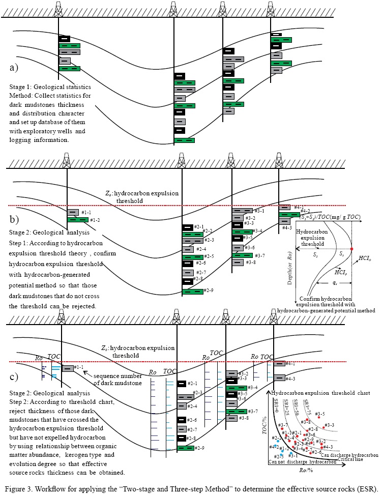 Many methods for determining ESR have been proposed, including identification through simulation experiments, identification based on a lower limit of organic carbon content, and identification using analysis of the hydrocarbon content in closely sampled core samples (Jiang et al., 2010b). However, the applications of these methods are limited by core availability, experimental analysis cost, sample amount and experiment conditions, which leads to poor maneuverability and lopsided results. This paper discusses a new method for identification of the ESR in E3d, named the "two-stage and three-step method" (Jiang et al., 2010b). This new method enables us to reliably determine distribution of ESR in petroliferous basins. The process of this method is as follows: