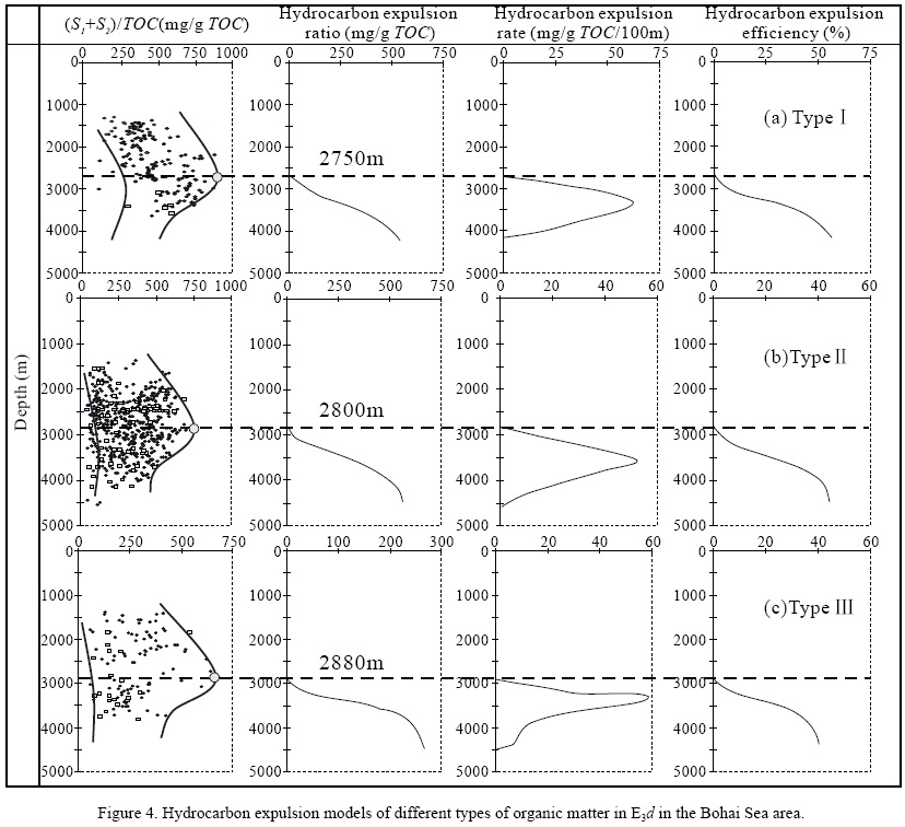 Different types of organic matter in source rocks will result in differences in hydrocarbon generation potential and hydrocarbon expulsion (Pang, 1995). The organic matter types of source rocks in the study area can be classified into three groups: Type I kerogen is mainly located in the center of the sag, Type III is distributed in the edge of the sag, and type II is located between them (Li et al. ,2001; Chi, 2001; Wang et al. ,2004). Thus, in this paper, three hydrocarbon expulsion geological models are established. The models arebased on the type of kerogen (Figure 4), using a database of 1234 Rock-Eval pyrolysis analysis of samples from the Dongying Formation, Bohai Sea area (Table 1).