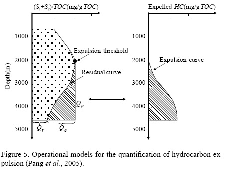 Basic approach. The hydrocarbon expulsion threshold refers to the critical geologic condition at which the amount of hydrocarbon generated satisfies the residual needs for hydrocarbon in various processes, including self-adsorption, interstitial water dissolution, oil dissolution (gas), capillary blockage, etc. Consequently, lots of oil and gas can be expelled and can migrate in separate phases during the burial process (Pang, 1995). It is obvious that only dark mudstones that had crossed the hydrocarbon expulsion threshold could possibly expel hydrocarbons, and the hydrocarbon generation potential method can be used for discrimination (Zhou and Pang, 2002; Jiang et al., 2007). The method is theoretically based on the principle of conservation of matter, namely that the amount of organic matter in the source rocks remains constant before and after hydrocarbon generation and migration. A decrease in the amount of the organic matter can occur as result of substance exchange between the source rocks and the surroundings. In terms of Rock-Eval pyrolysis, S1 represents free volatile hydrocarbons thermally flushed from a rock sample at 300 °C, S2 represents products of cracking during standard Rock-Eval pyrolysis temperatures (300-600 °C), and the sum (S1+S2) is generally used to signify the content of hydrocarbon in source rocks (Espitalié et al., 1977; Tissot and Welte,1978,1984). Thus, the (S1+S2)/total organic content (TOC) ratio could be used to delineate the potential of source rocks to generate hydrocarbons. In other words, it could reflect volumes of hydrocarbons generated by per unit of TOC in the source rocks. Zhou and Pang (2002) called the (S1+S2)/TOC ratio as Hydrocarbon Generation Potential Index. Hydrocarbon expulsion begins (Figure 3b) when the index starts to decrease and the critical geologic condition is defined as the hydrocarbon expulsion threshold. Those dark mudstones that have not crossed the hydrocarbon expulsion threshold could be reasonably eliminated after determining the hydrocarbon expulsion threshold.