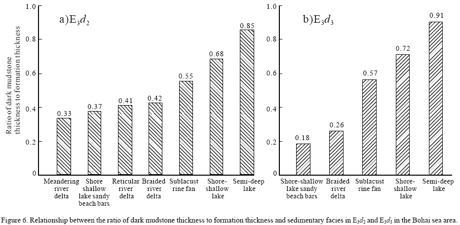 So far, 165 wells have been drilled in the E3d2 and 36 wells have been drilled in the E3d3 of the Bohai Sea area. The results show that the dark mudstone thickness of E3d2 ranges from 2 to 814 m, averaging 180 m, and that the thickness of E3d3 ranges from 3.5 to 496 m with a mean thickness of 143 m. Considering that these unevenly drilled wells are mainly located on uplifts, the relationship between the dark mudstone thickness and sedimentary facies is obtained by evaluating the ratio of the dark mudstone thickness to the formation thickness in wells and sedimentary facies (Figure 6). For the area of the dark mudstone with less wells, thickness can be predicted from sedimentary facies and strata thickness. Finally, the map view distribution of the dark mudstone of E3d can be derived (Figure 7).
