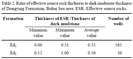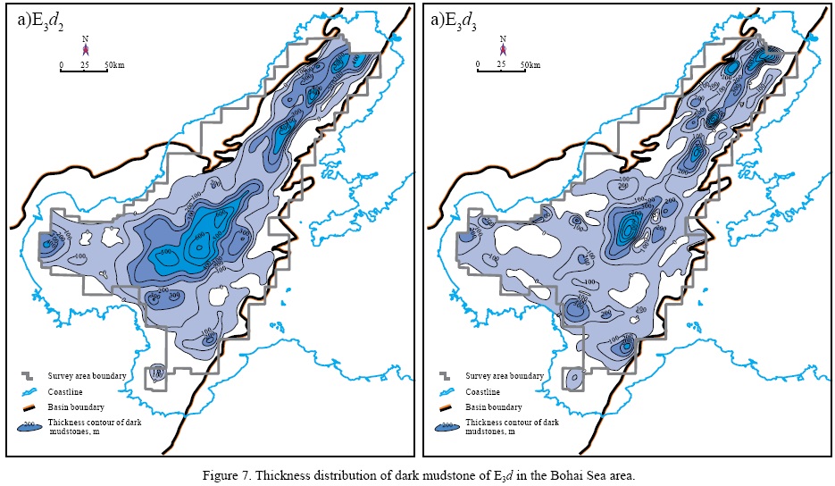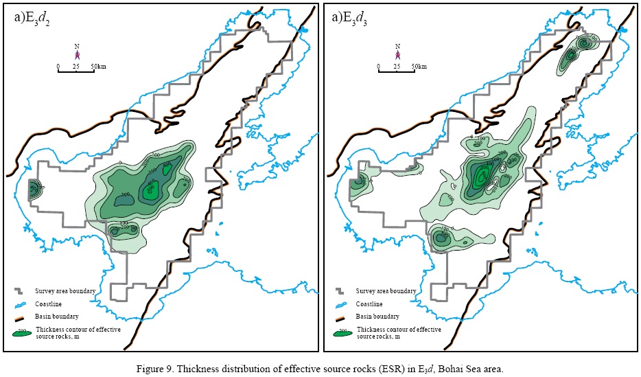Dark mudstones of E3d in Bohai Sea area are widely distributed with large thickness, being the thickness of E3d2 dark mudstone larger than that of E3d3. However, the effective source rocks of E3d have a limited distribution. ESR of E3d2 are mainly located in Bozhong, Huanghekou, Qikou and Bodong sags, with an average thickness of 200 m; while ESR distribution of E3d2 is relatively broad, mainly in Bozhong, Bodong, Huanghekou, Liaozhong, Qinnan, Qikou and Nanpu sags, with an average thickness of 230 m.