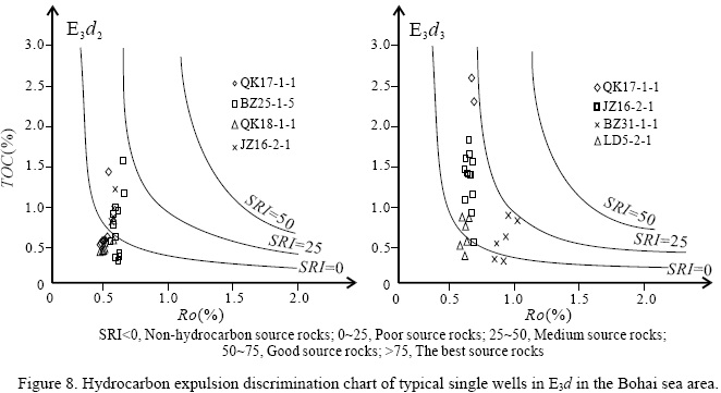 Values of SRI<0 mean that the amount of hydrocarbons generated in rocks is less than the critical saturation amount of residual hydrocarbons, and thus the rocks are non-source rocks; on the contrary, rocks are considered source rocks when SRI >0. The larger the SRI, the better the quality of source rocks (Figure 3c). A statistical analysis of numerous geologic data undertaken by Pang (1995) shows that the hydrocarbon generation, retention and expulsion amount is determined by TOC, vitrinite reflectance (Ro) and source rock type. Based on this recognition, Pang (1995) established the relation chart of SRI versus the above three parameters to distinguish source rocks from non-source rocks.